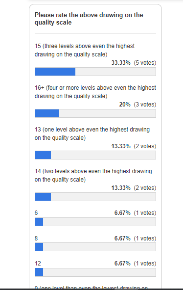 Although technically a deviation IQ based on an interval scale, it does not necessarily imply one in a billion level ability, because the scale lacks precision (big jumps in IQ between levels) and scores have not been forced to fit the bell curve, though I suspect drawing ability has a naturally normal distribution among biologically normal (i.e. non-savant) people with no special training.
