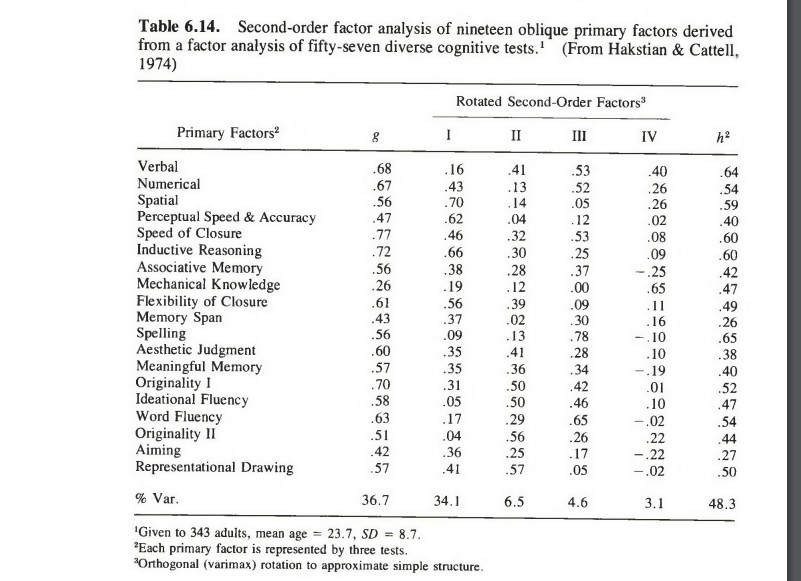 Hakstian and Cattell (1974) administered 57 ability tests to 343 adults averaging 23.7 years of age. The tests are extremely diverse and probably constitute the most complete samplings of the domain of cognitive tests to be found in the entire literature. Each of the fifty-seven tests was homogeneous in content so as to be highly representative of a particular primary mental ability. It would be hard to imagine a much greater variety of tests than the fifty-seven tests included in this battery. Hakstian and Cattell factor analyzed the battery, which yielded nineteen significant interpretable primary factors that were rotated to oblique simple structures , that is, the primary factors were intercorrelated. Each of the primary factors is represented by three similar tests.