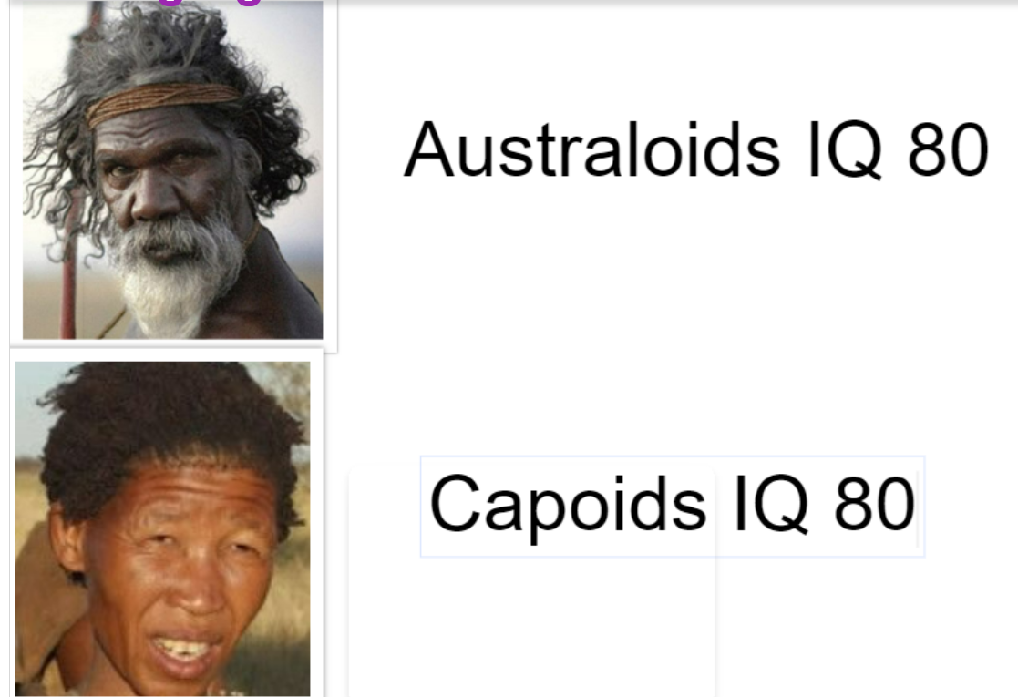 But fortunately the genetics of Bushmen are preserved in the South African Coloureds and the IQs of these have been well studied. They have a phenotypic IQ of 82 and, I estimate, a genetic IQ of 85.