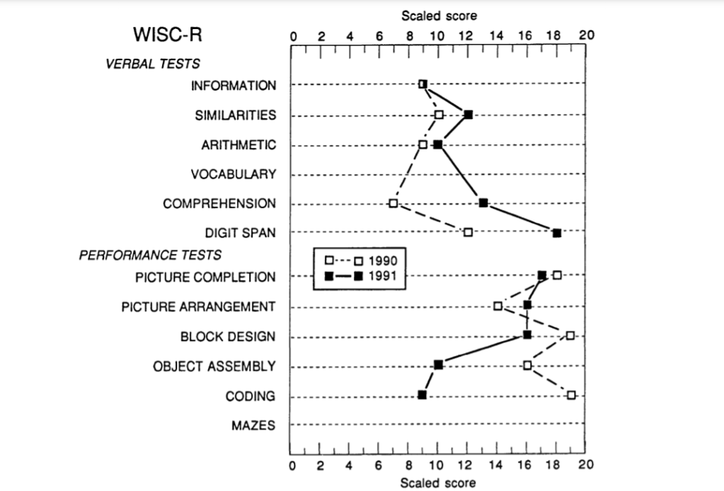 Interesting study about a girl with a 54 point gap on the WISC-R’s verbal and performance scale. When tested at 11, her verbal IQ was 96 and her performance IQ was 150! But when re-tested at age 12, her verbal IQ had jumped to 114 and her performance IQ had tumbled to 126, for only a 12 point gap.