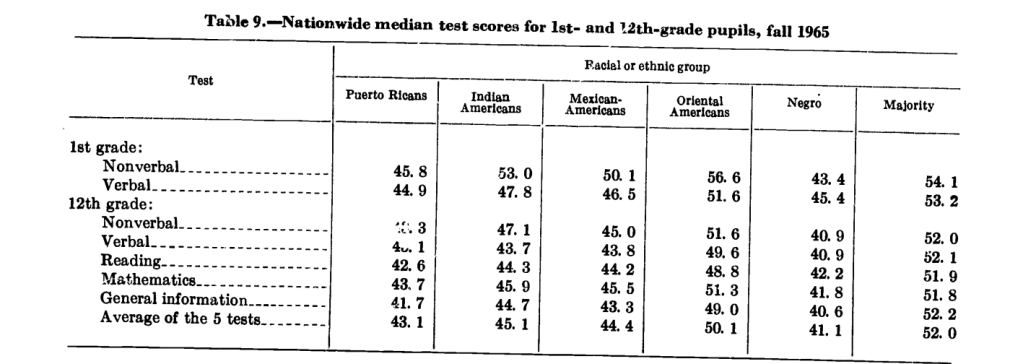 The largest study ever of American ethnic IQ differences in a representative sample is the Coleman study. Here we saw 5 different ethno-racial groups compared at multiple ages on 5 different mental tests. The study involved 645,000 students from 4000 public schools. All test scores were expressed using a scale where the Americans on the whole average 50 with a standard deviation of 10.
