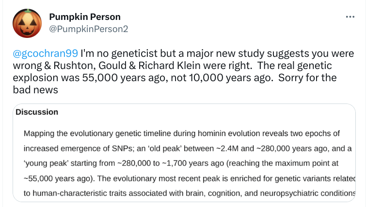 Point four: By the late Upper Paleolithic, the average brain size of our species mysteriously collapses to 1441 cc. Of course one shouldn’t over-interpret this as the DeSilva brain size database is not huge so sampling error is always possible. But taking the data at face value, one possibility is selection pressures relaxed after the Neanderthals went extinct 40,000 years ago, leaving our species with less competition.