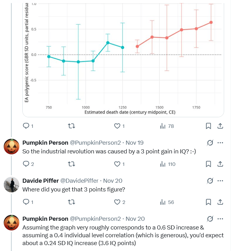 Davide Piffer claims that from the year 700 to 1850, Northern Europe saw a 0.78 standard deviation (SD) Increase in polygenic scores that predict education, and by extension IQ. But does that mean early Medieval Europeans were genetically 0.78 dumber, by which I mean that if we cloned them and raised them in today’s Northern European homes, they would score close to 0.78 SD lower than the average White? IQ 100 vs IQ 88 (U.S. white norms which yield IQs somewhat lower than those normed on the full U.S. population).