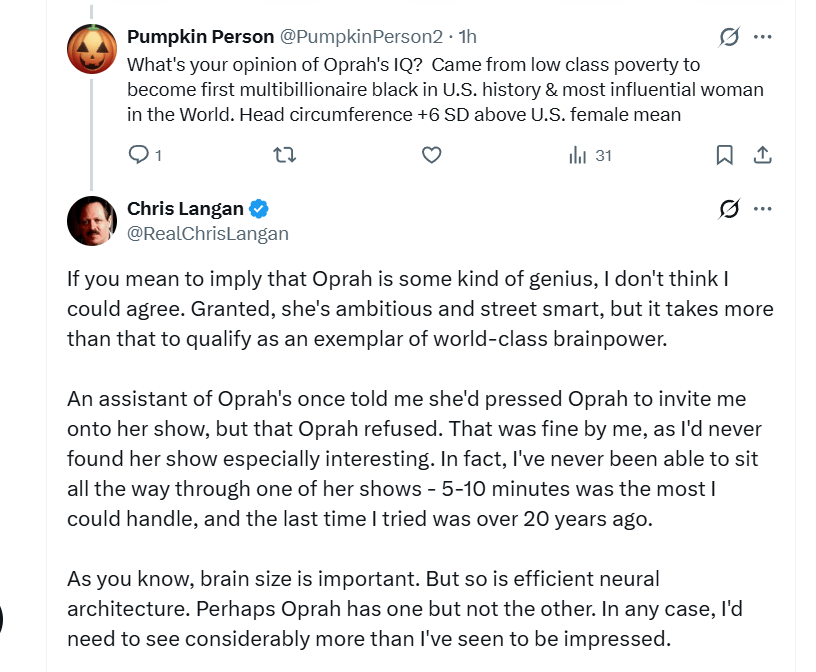 Great of Chris to respond because there’s not a person I can think of whose World class IQ has been more authenticated, first by the legendary Ron Hoeflin and than independently by ABC news! I encourage everyone to check out his X account and let me know what you think about the extremely provocative content. It makes sense that Oprah wouldn’t have him on but he’d be perfect for Tucker Carlson, Joe Rogan, Candace Owens or even Breaking Points.